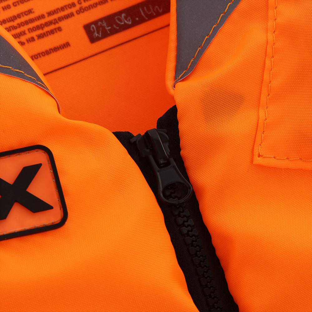 Жилет снабжен световозвращающими вставками на груди и спине, и свистком. В жилете предусмотрен карман на «молнии» для мелочей.